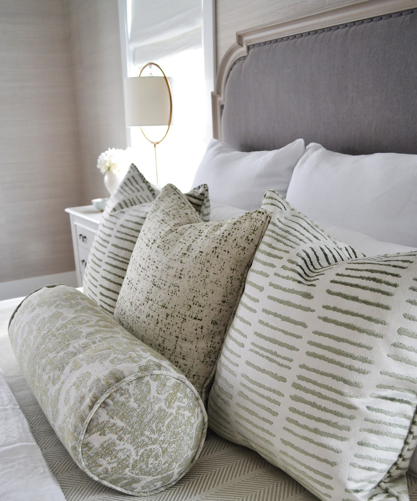 New custom pillows made by my fabricator, with gorgeous new fabrics from Robert Allen, finish off the white bedding. This moss green color might be my new favorite. PS - Moss is the new Sage. :)